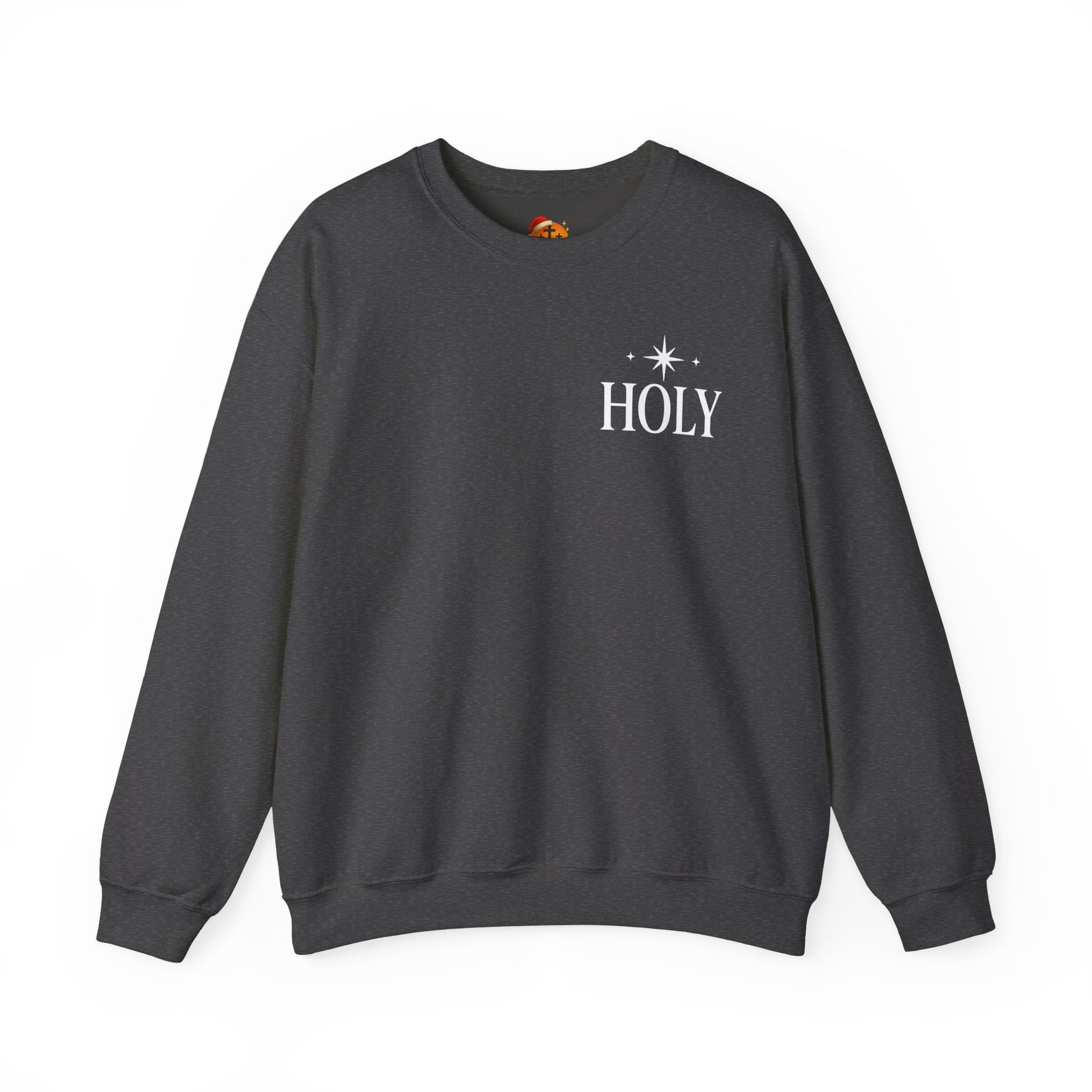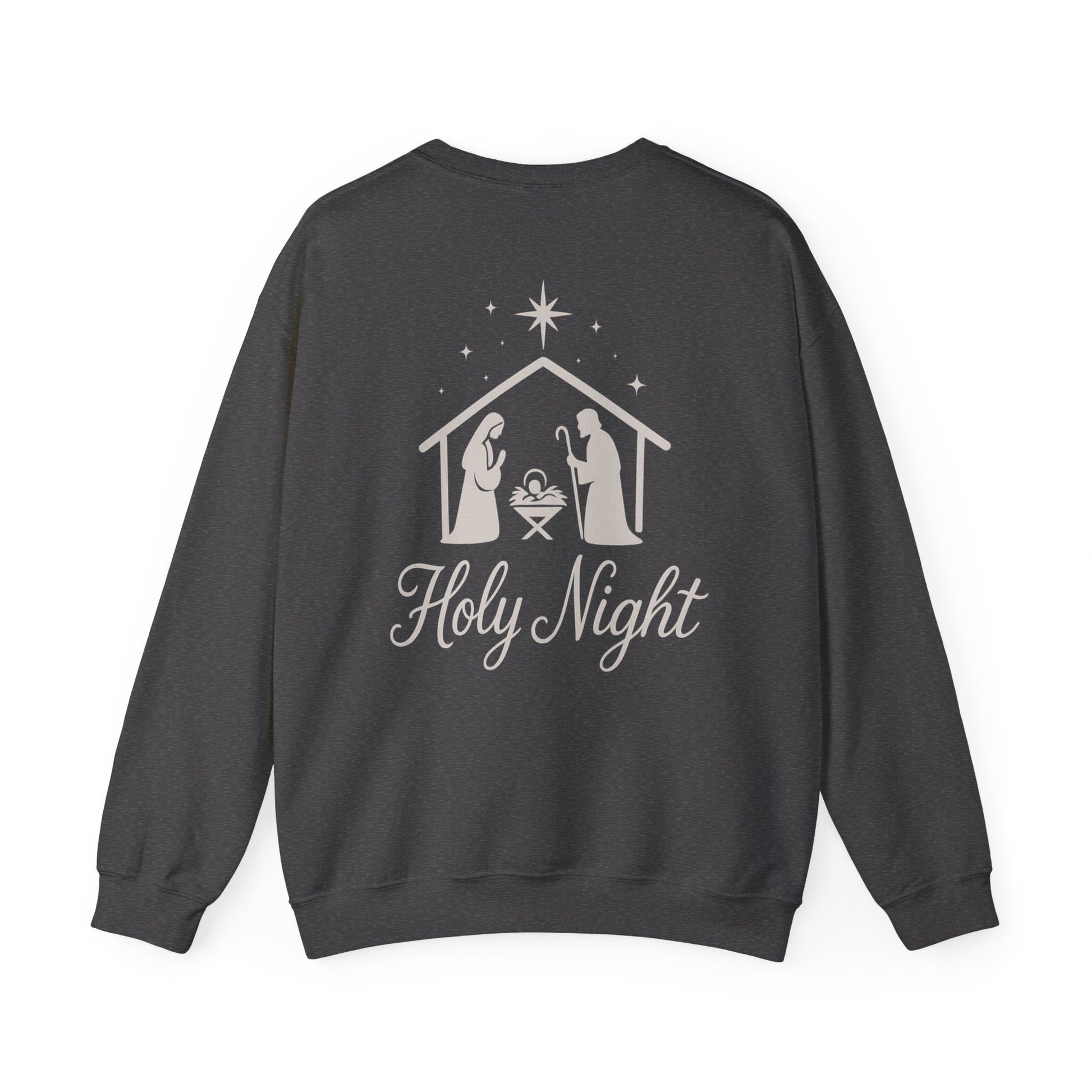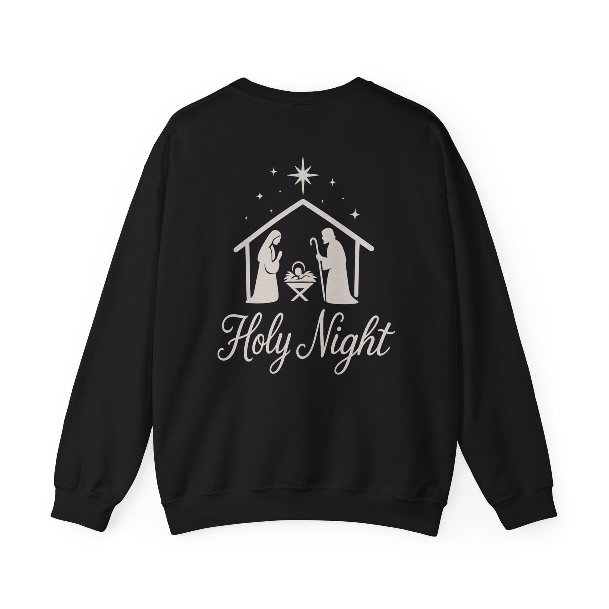 This cozy crewneck carries a quiet, reverent vibe — a soft black sweatshirt embroidered with a small “HOLY” and a star at the front, and a gentle nativity scene across the back reading “Holy Night.” It feels like a warm church hymn on a cold evening: understated, respectful, and made to be worn during moments of reflection. The medium-heavy fabric drapes casually while the ribbed collar and cuffs hold their shape. Wear it to candlelight services, caroling nights, or slow winter evenings at home — it blends into ritual and routine without shouting. The muted embroidery keeps the design classic and wearable, while the durable stitching and tear-away label keep comfort high through repeated wear and washes.