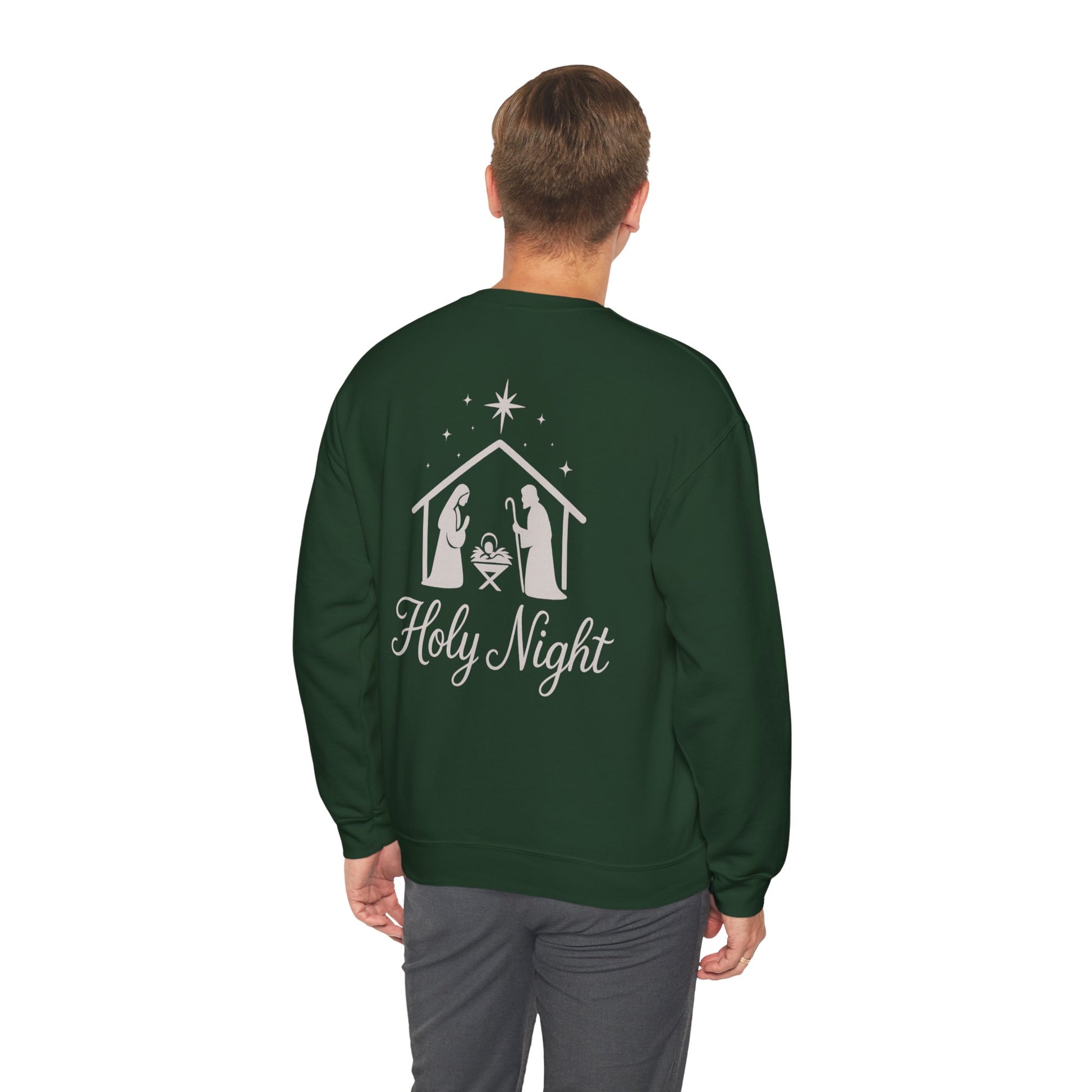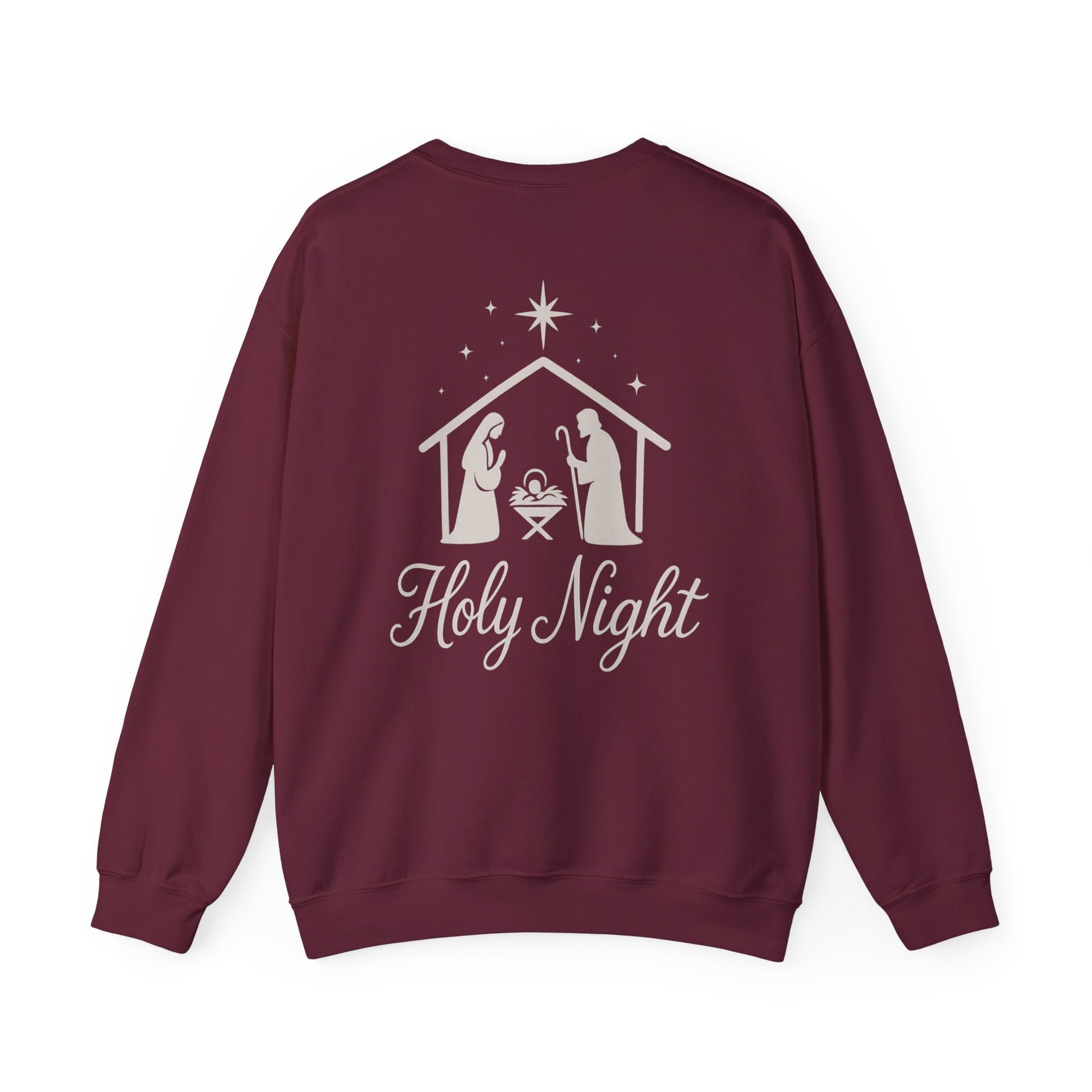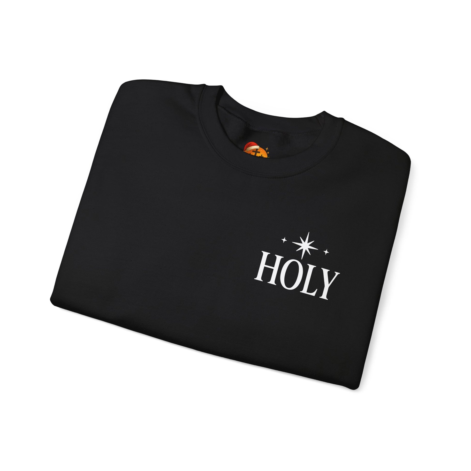 This cozy crewneck carries a quiet, reverent vibe — a soft black sweatshirt embroidered with a small “HOLY” and a star at the front, and a gentle nativity scene across the back reading “Holy Night.” It feels like a warm church hymn on a cold evening: understated, respectful, and made to be worn during moments of reflection. The medium-heavy fabric drapes casually while the ribbed collar and cuffs hold their shape. Wear it to candlelight services, caroling nights, or slow winter evenings at home — it blends into ritual and routine without shouting. The muted embroidery keeps the design classic and wearable, while the durable stitching and tear-away label keep comfort high through repeated wear and washes.