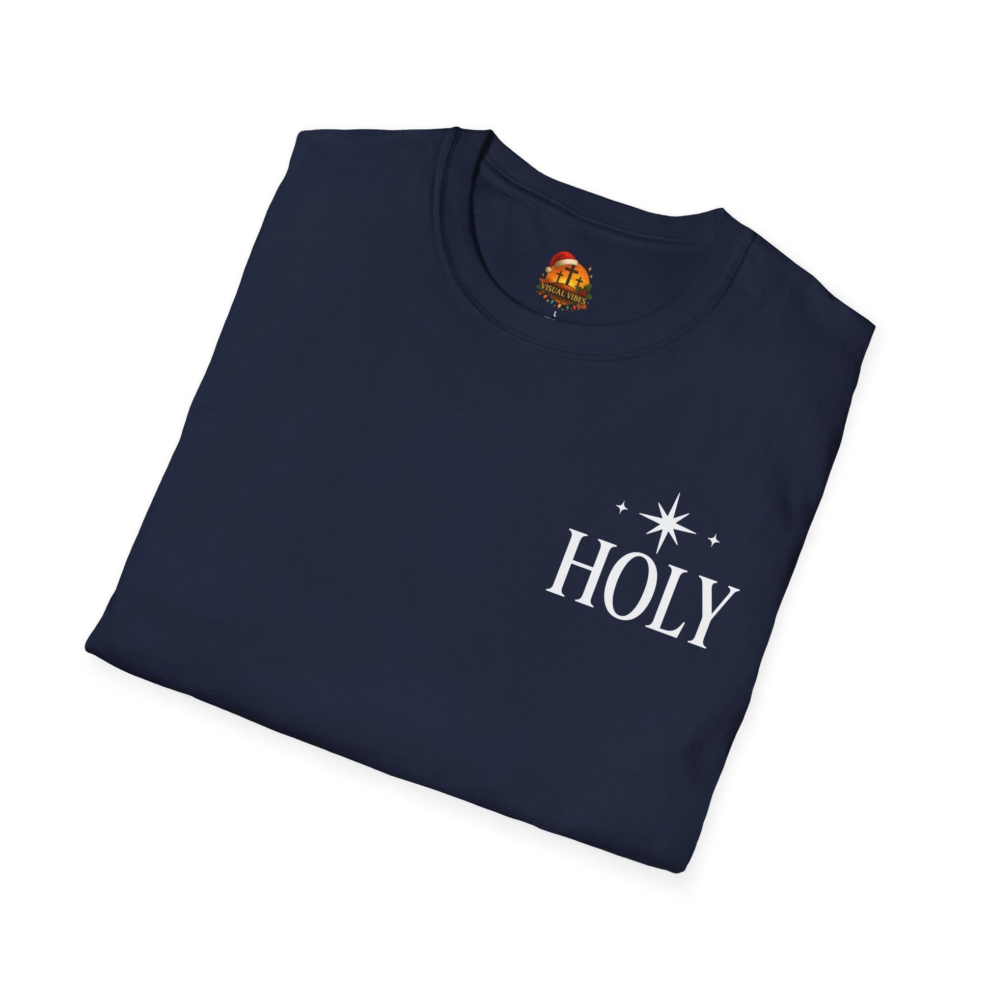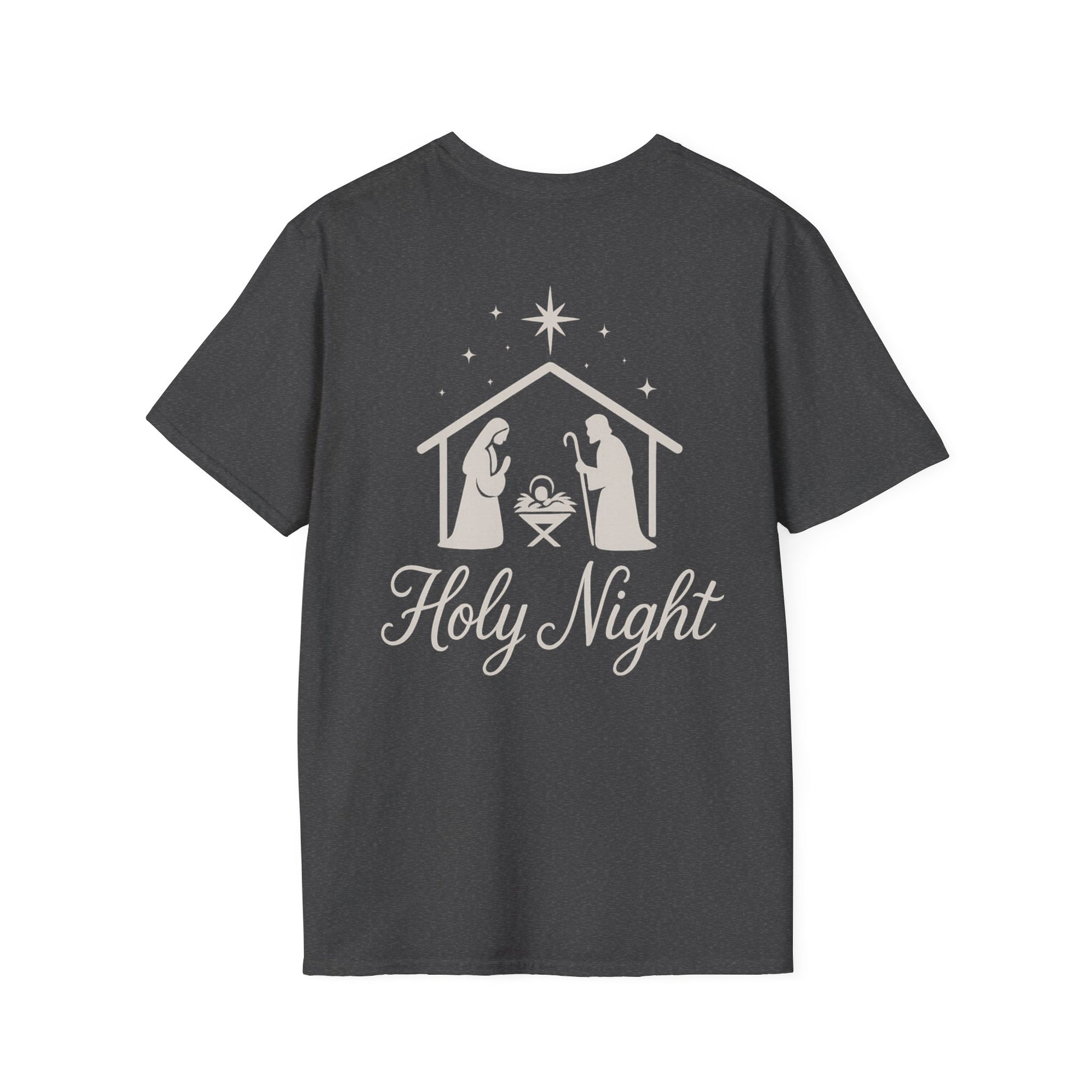 Soft, simple, and quietly reverent — this lightweight tee carries a small chest emblem that reads “HOLY” and a gentle nativity scene across the back with the words “Holy Night.” The crew-neck silhouette and smooth ring-spun cotton make it comfortable for long evenings at church services, family gatherings, or caroling by lamplit streets. It wears like a calm statement: minimal, respectful, and thoughtfully made from breathable fabric that prints clearly. The subtle pearlized tear-away label and stable shoulder tape keep the fit neat, while the tubular knit body creates a clean silhouette that won’t twist. For those who prefer understated sacred imagery, this shirt layers easily under a coat or over a long-sleeve for colder nights and feels like a quiet reminder of the season.