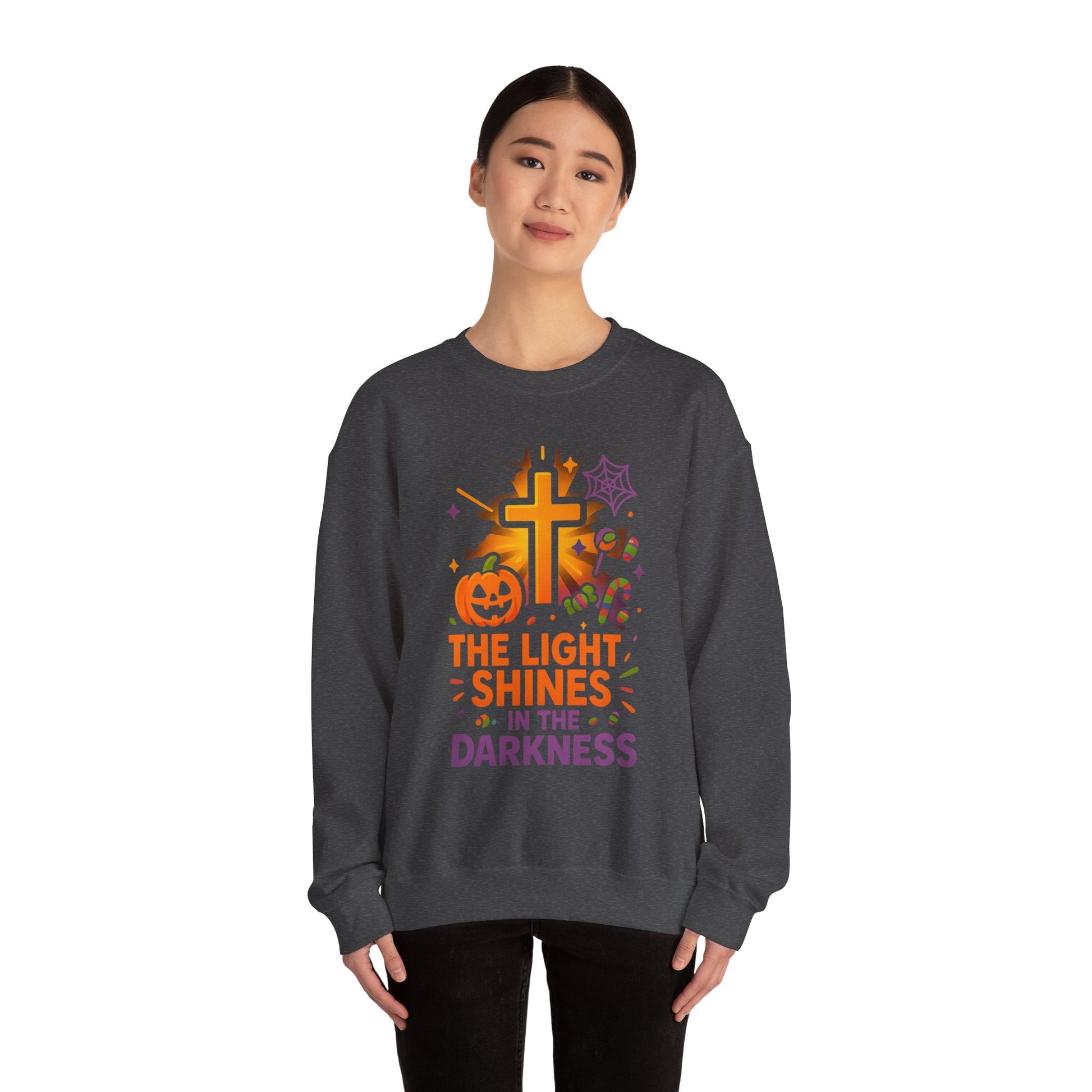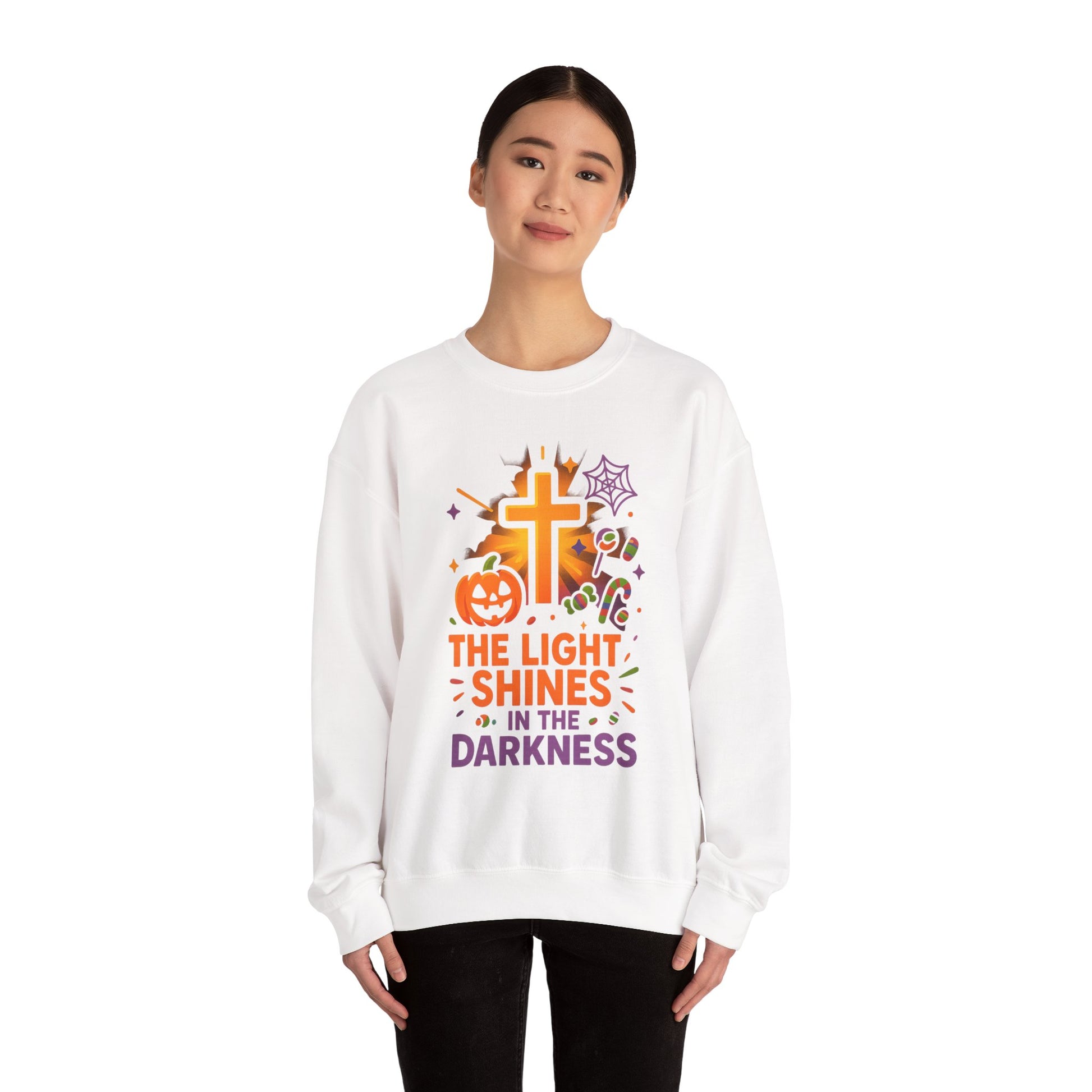 Faith-Inspired Halloween Sweatshirt, Unisex Crewneck, Cozy Fall Fashion, Christian Gift, Halloween Celebration, Light in Darkness