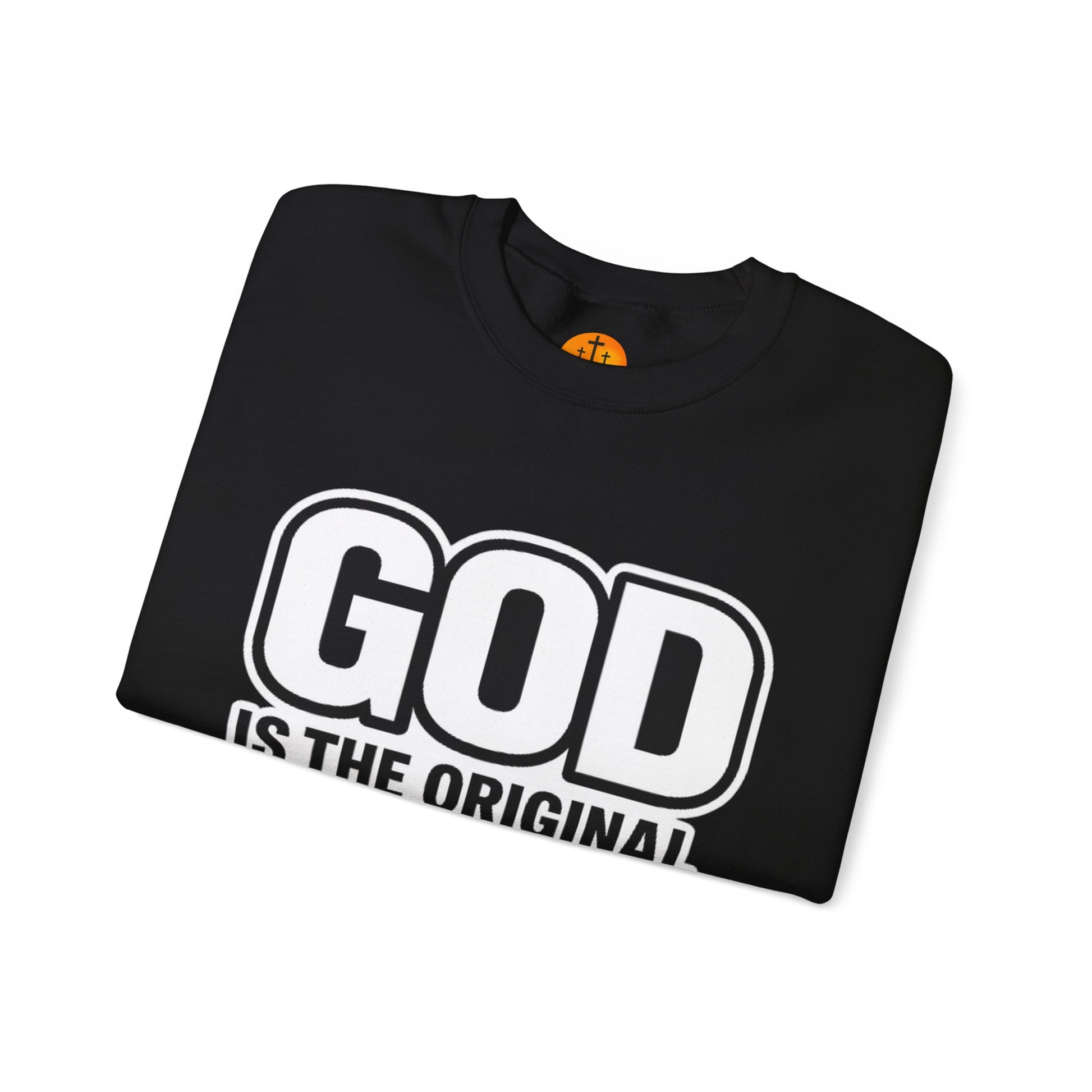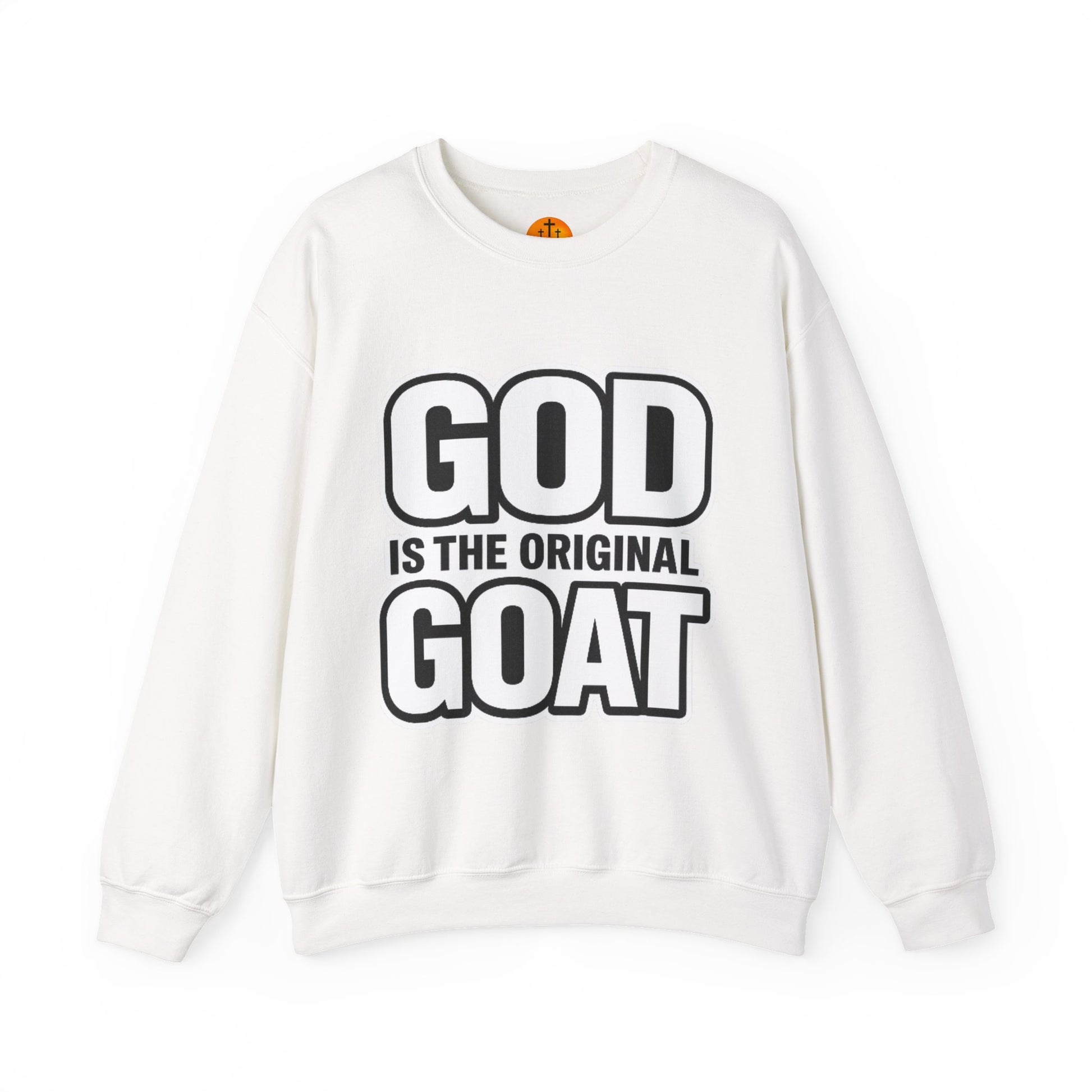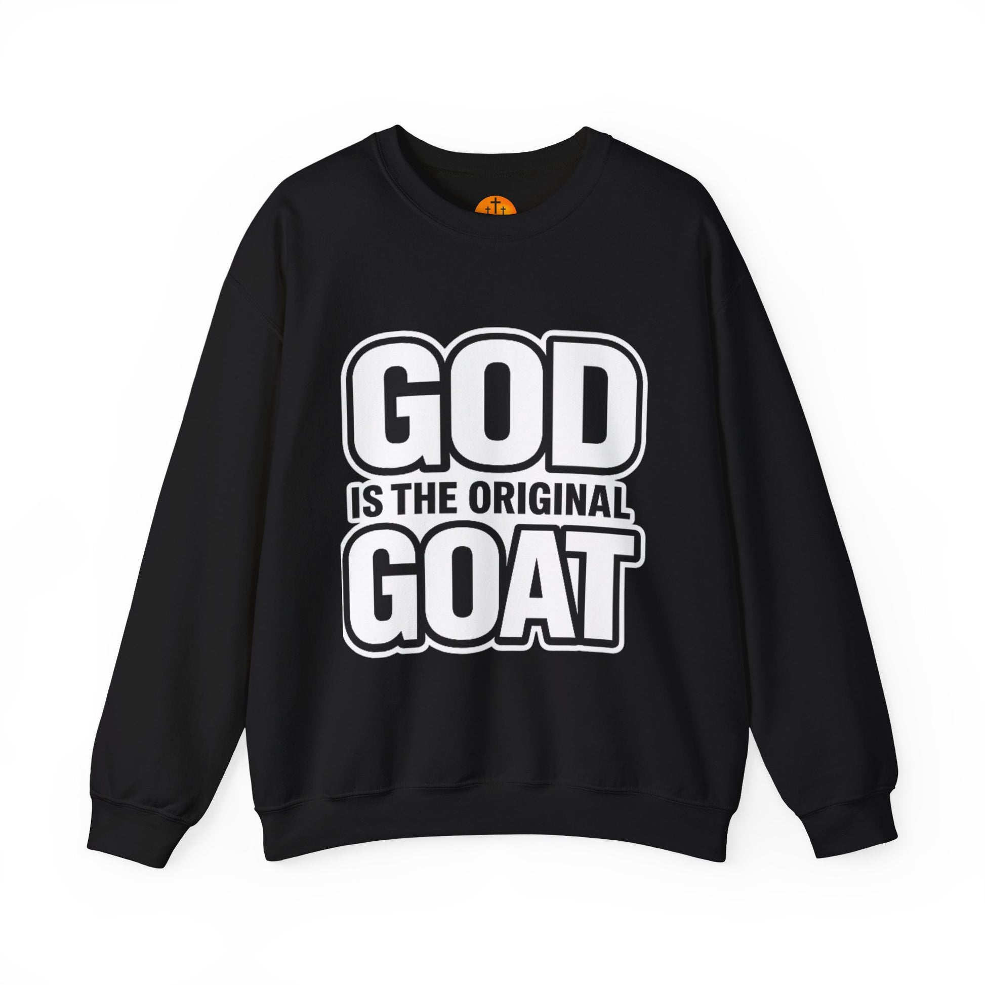This crewneck sweatshirt speaks with bold, confident humor. The large, high-contrast lettering—"GOD IS THE ORIGINAL GOAT"—lands like a wink and a statement, perfect for quiet Sundays, casual coffee runs, or low-key gatherings where faith and fun meet. The medium-heavy cotton-poly blend feels substantial without being stiff; the tubular knit and ribbed collar hold shape through washes. Wear it oversized with jeans or layered under a jacket; the clean back keeps the focus on the front message. It’s for people who like their wardrobe to say something honest and a little playful, while still feeling soft and built to last.
