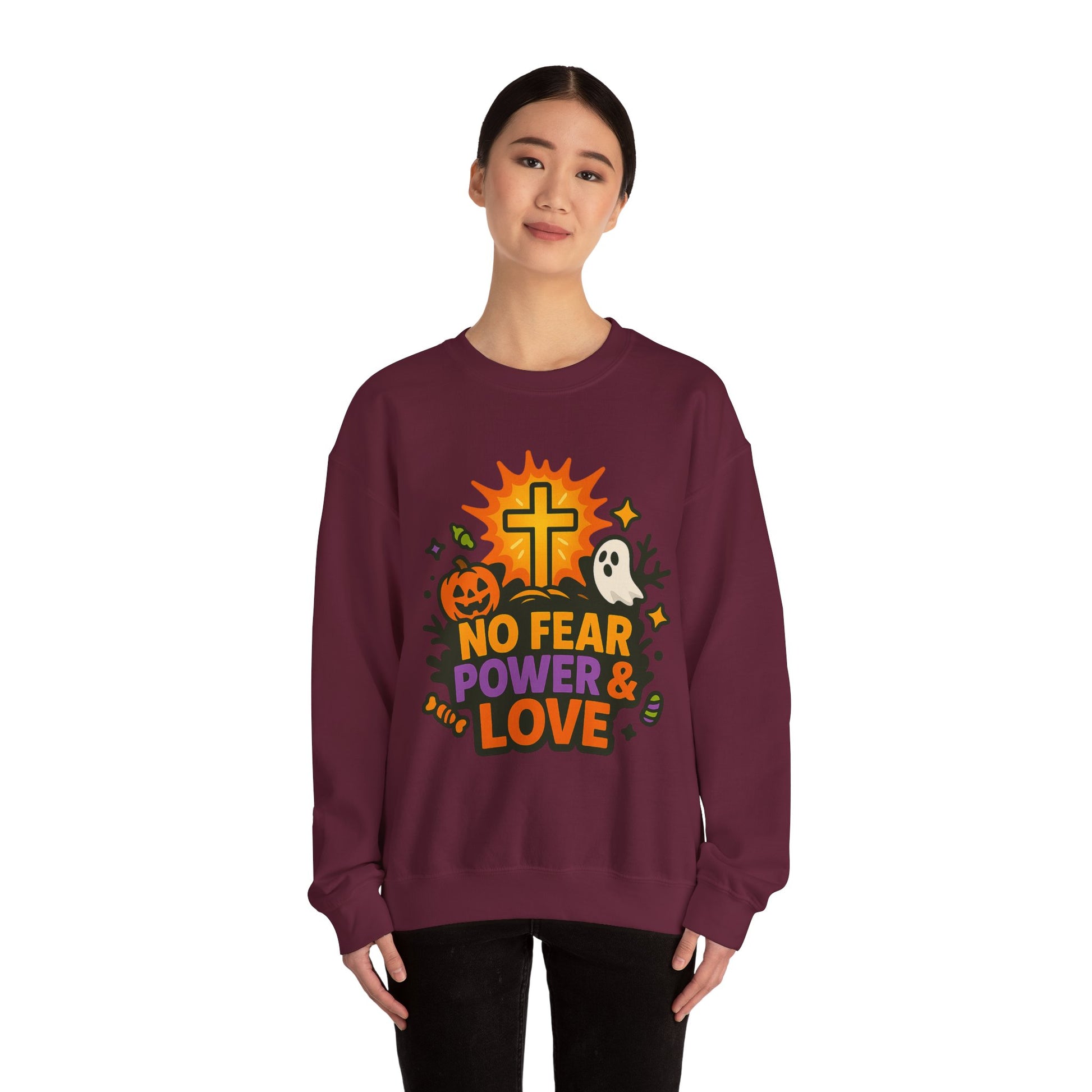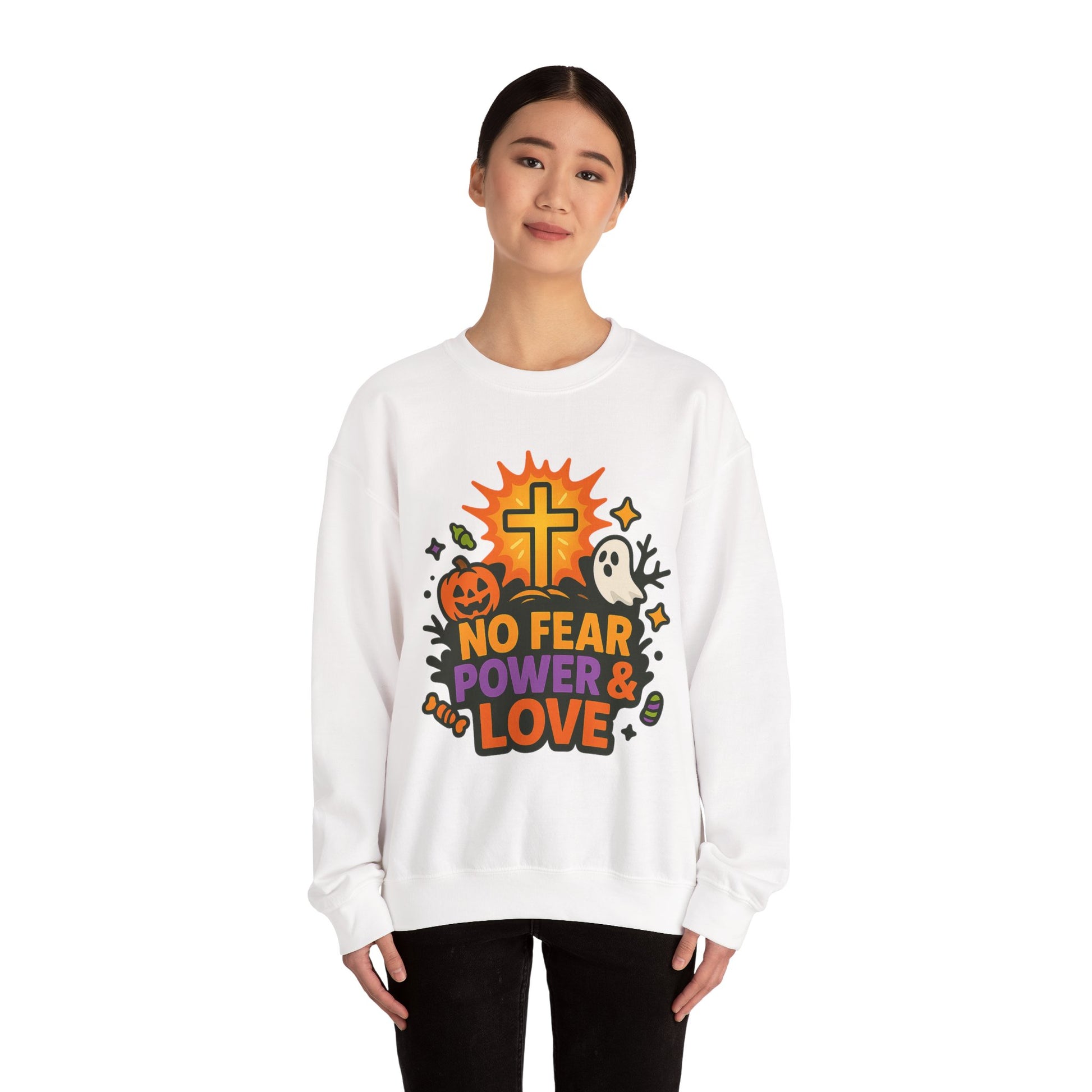 Embrace the spirit of warmth and comfort with our Unisex Heavy Blend™ Crewneck Sweatshirt! This stylish sweatshirt features a bold, eye-catching design that radiates positivity with the inspiring motto 'NO FEAR POWER & LOVE'. Perfect for cozy fall nights or casual gatherings, it brings a sense of community and celebration wherever you go. Ideal for anyone looking to spread good vibes, it resonates especially well during Halloween festivities, cozy family gatherings, or festive parties. Whether you're dressing down for a chill day at home or layering up for an outdoor event, this sweatshirt adds both comfort and a unique flair to your wardrobe. Celebrate the season in style and lift spirits with this one-of-a-kind piece!