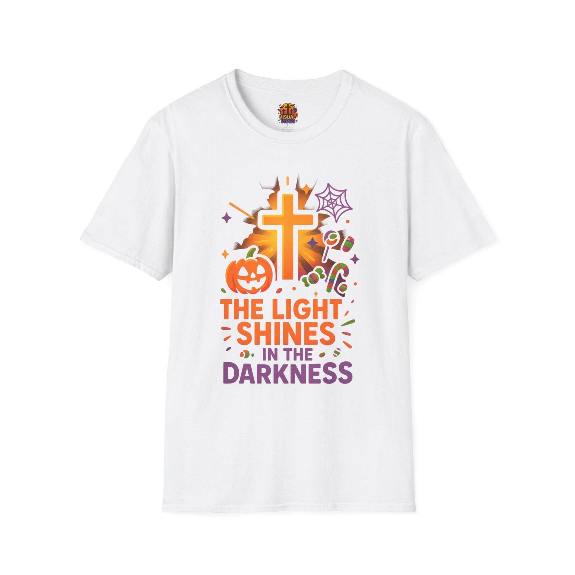 Embrace warmth and positivity with this Unisex Softstyle T-Shirt, designed to brighten your day. The vibrant graphic featuring a cross, Halloween elements, and uplifting text captures the spirit of hope, making it an ideal piece to wear during fall celebrations, especially Halloween and Thanksgiving. Perfect for casual gatherings, family events, or simply lounging at home, this shirt resonates with adults who cherish faith and joy. Style it with your favorite jeans or layer it under a jacket for cooler days. Wear this t-shirt to express your beliefs and stand out with a unique, cheerful design!
