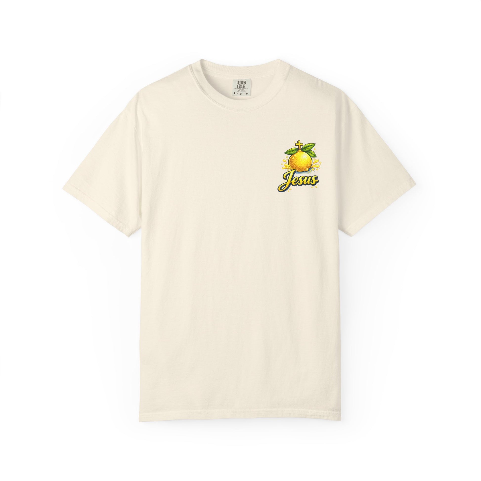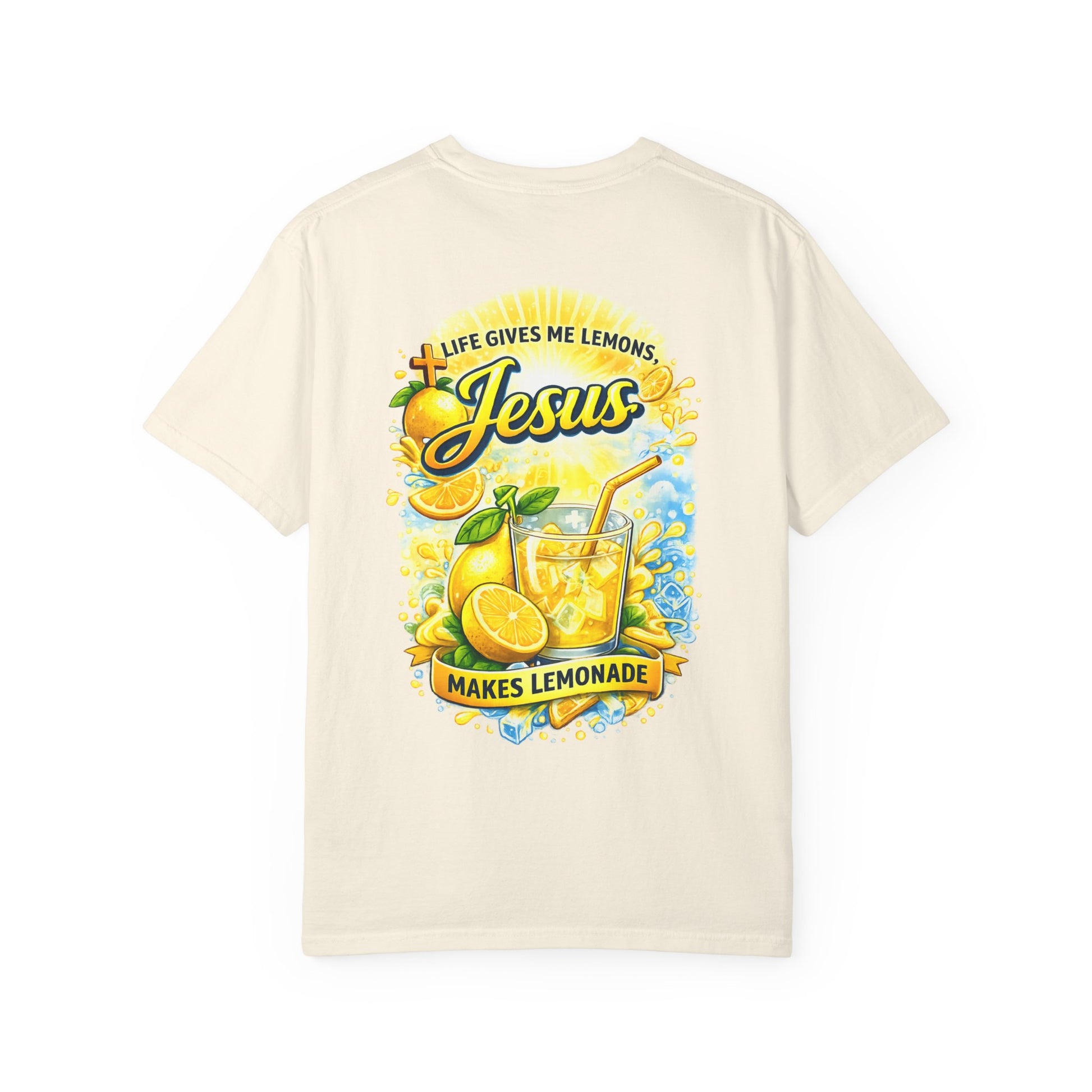 Sun-warmed cotton and a bold, hopeful message — this garment-dyed tee feels lived-in from the first wear. A hand-drawn lemon motif sits small over the heart and blooms into a radiant back illustration: a pitcher of lemonade, bright citrus slices, and the uplifting phrase “Life gives me lemons, Jesus makes lemonade.” The heavyweight, relaxed cut drapes easily over jeans or shorts and softens with every wash, carrying a casual, soulful energy. Wear it to slow Sunday mornings, community service days, or backyard gatherings where faith and friendship mingle like sunshine and citrus. The sewn-in label and clean tubular knit give it a thoughtful, honest finish that fits right into everyday life.