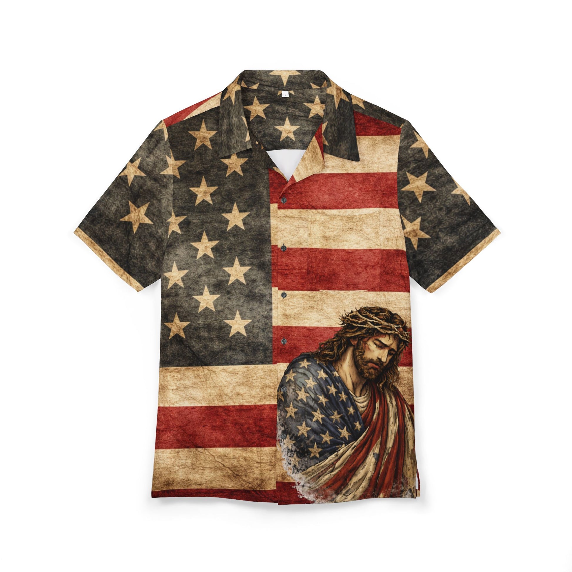 This short-sleeve button-down brings together quiet devotion and weathered Americana in a wearable statement. Soft, flowy fabric drapes easily over the shoulders, letting the vintage-flag backdrop and the reverent figure carry the visual weight. Wear it to a backyard BBQ, an evening church gathering, or a summer parade when you want a composed, heartfelt look without fuss. The structured collar and placket keep the silhouette tidy, while the all-over print keeps the mood expressive — familiar, worn, and sincere. Buttons are color-matched for a seamless finish, and a sewn-in label and U.S. assembly bring a considered, honest touch to the piece.