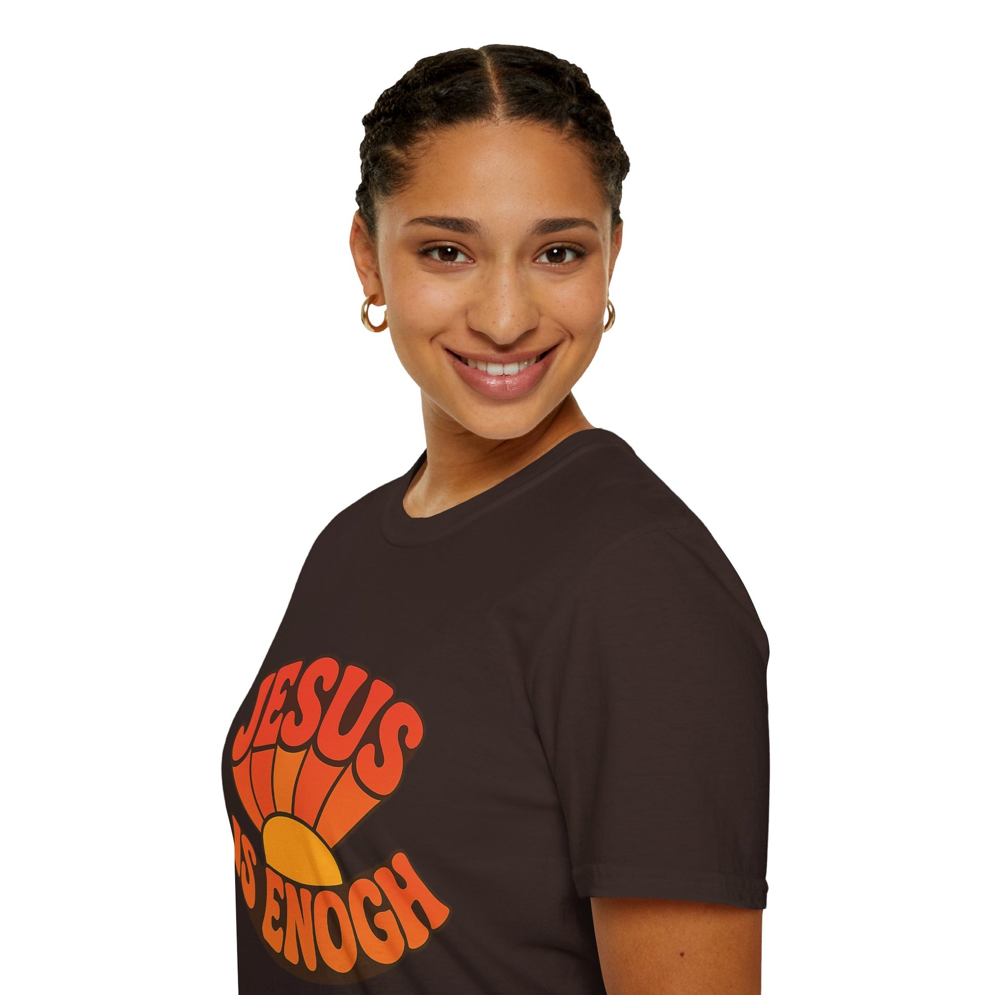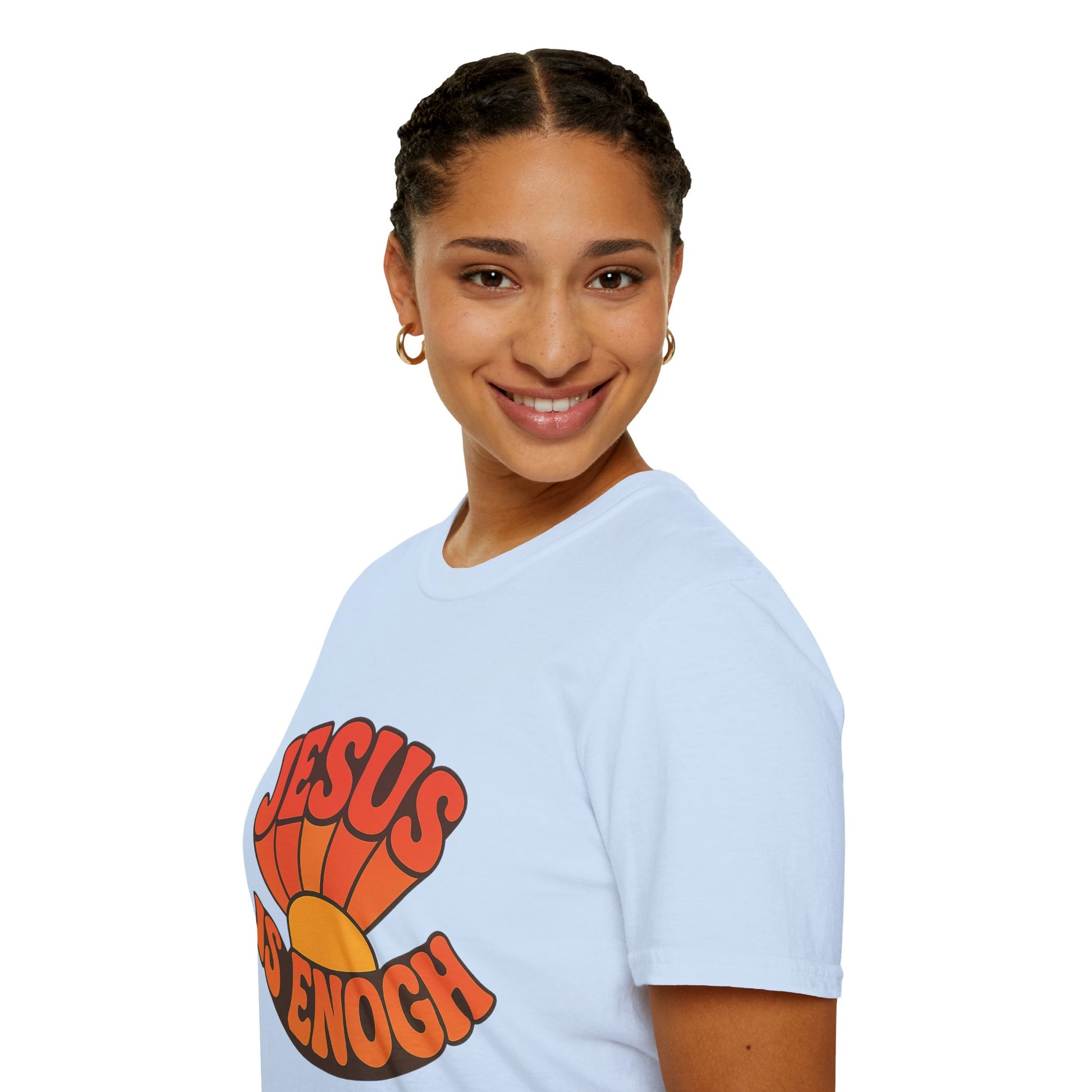 Introducing our stylish Unisex Softstyle T-Shirt, perfect for expressing your faith and embracing positivity in everyday life. This tee radiates a warm and uplifting vibe with its vibrant design, featuring the uplifting phrase "JESUS IS ENOUGH". Ideal for casual outings, church gatherings, or community events, this t-shirt allows you to make a statement while staying comfortable.