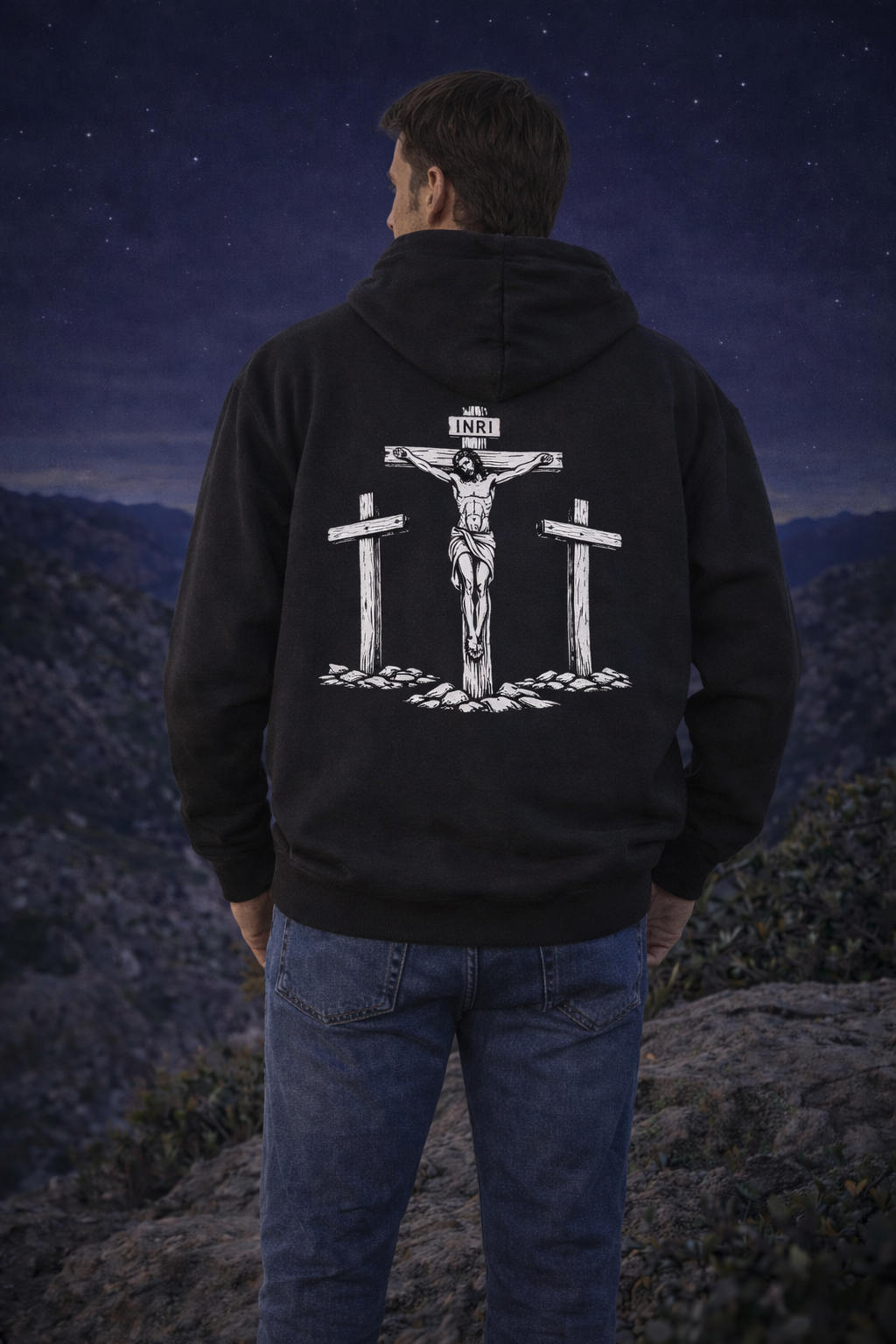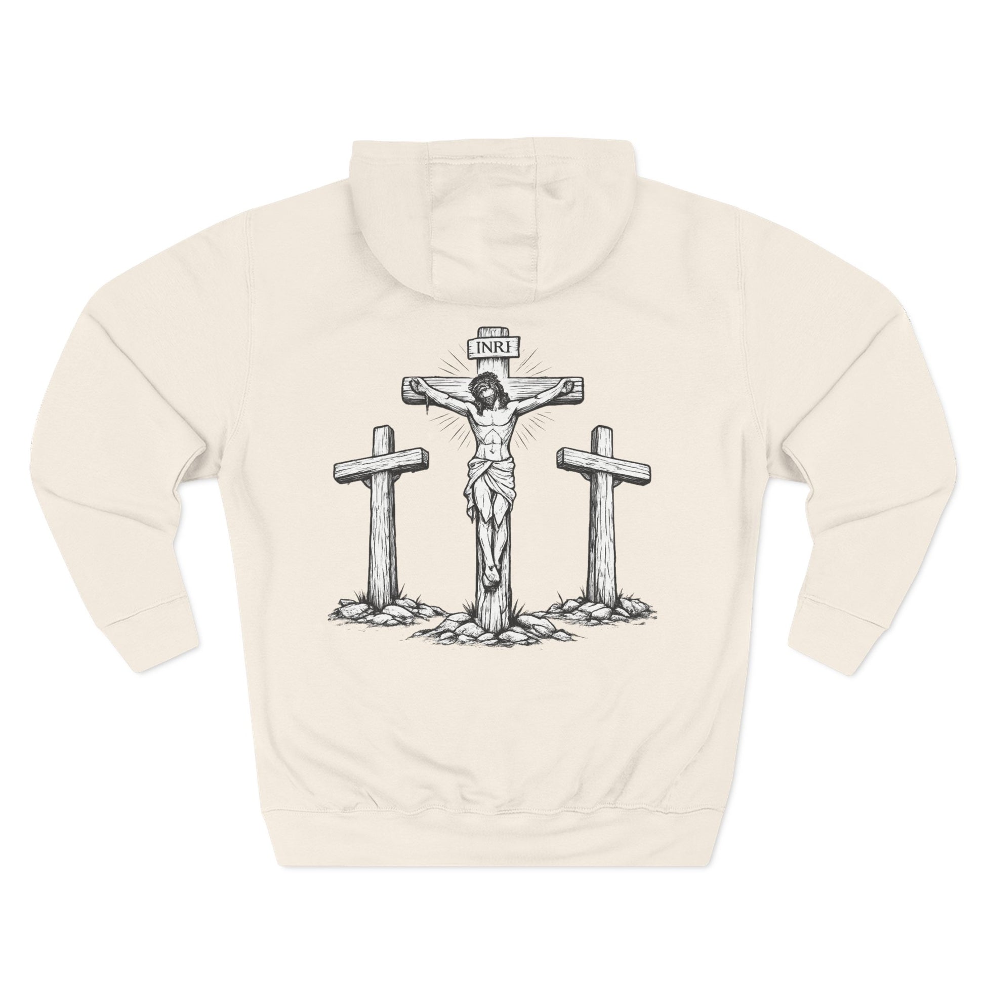 This fleece hoodie blends quiet reverence with everyday comfort. The front carries a subtle stitched emblem over the heart, while the back displays a finely detailed three-cross illustration that reads like a charcoal study—simple, contemplative, and striking. Medium-heavy fleece and a roomy kangaroo pocket make it comforting on cool mornings, and the adjustable hood keeps the silhouette classic and wearable. It sits comfortably in the rotation of someone who values meaningful imagery and a durable, lived-in feel—reach for it on reflective walks, church gatherings, or evenings spent with close friends. Product features - Soft 3-end fleece with a luxurious hand-feel - Medium-heavy weight (8.25 oz /yd²) for warmth without bulk - Roomy kangaroo pocket and adjustable hood with drawstrings - Embroidered left-chest emblem plus large detailed back print - Durable construction: double-needle topstitching and under 5% shrinkage Care instructions - Machine wash: cold (max 30C or 90F) - Do not bleach - Tumble dry: low heat - Iron, steam or dry: low heat - Do not dryclean